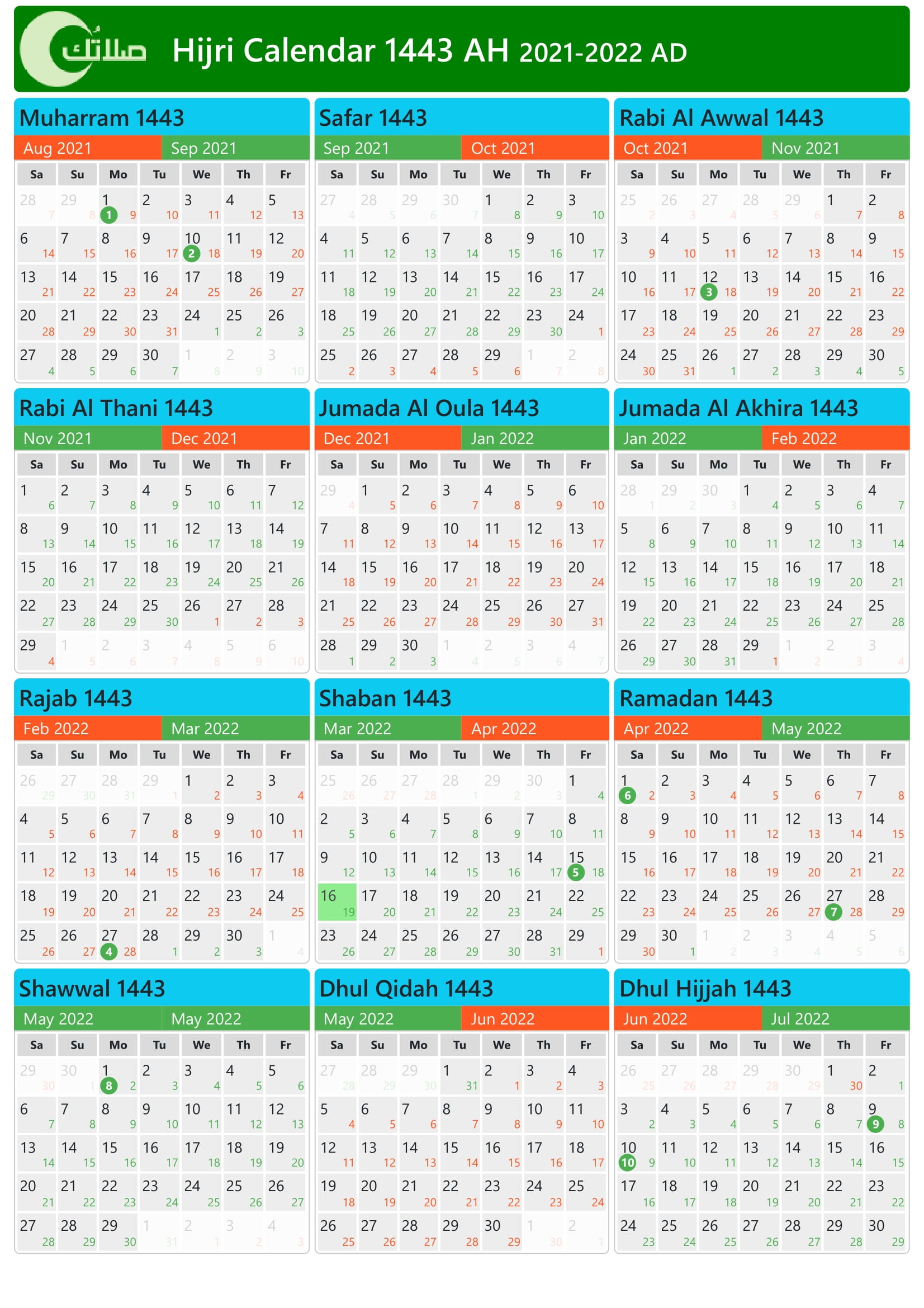 Islamic Calendar in Saudi Arabia 1443, 2021-2022 (Hijri Calendar)
